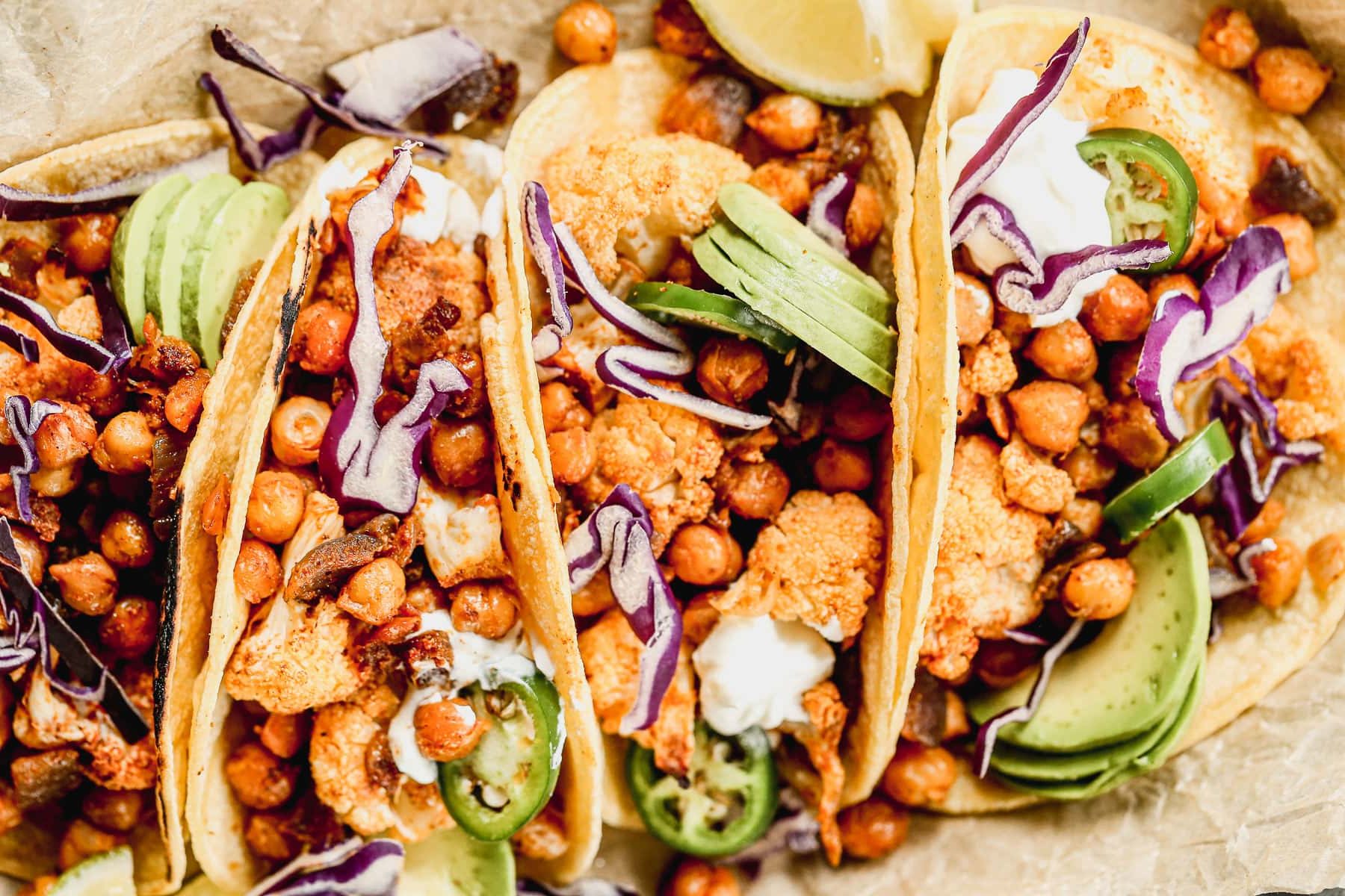 The best vegetarian, gluten free tacos you’ll ever have! Roasted cauliflower, sauteed chickpeas, in a corn tortilla, topped with sliced purple cabbage, jalapenos and sliced avocado.