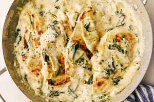 Delicious creamy white wine and garlic sauce with sauteed spinach and artichoke, topped with grilled chicken